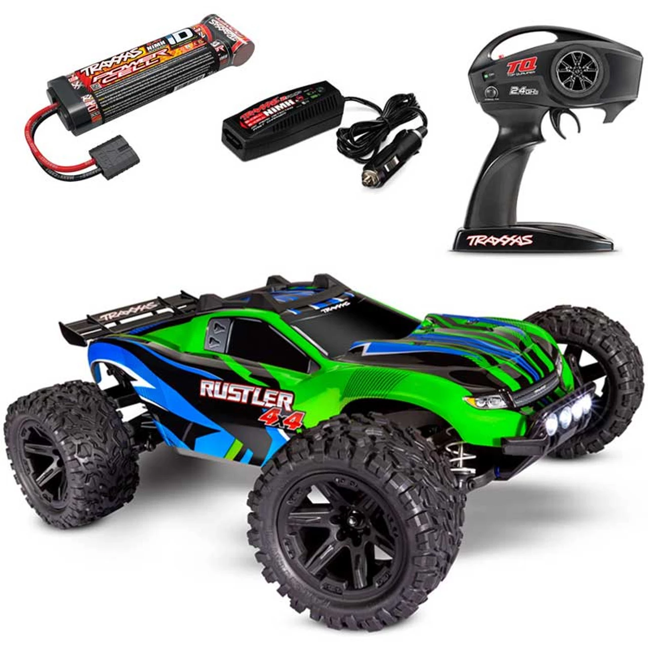 This is the This is the Traxxas Rustler 4×4 Brushed RTR Stadium Truck with 3000mAh NiMH 8.4V 7-Cell Flat Pack Battery and DC 4-Amp Quick Charger and LED Lights.