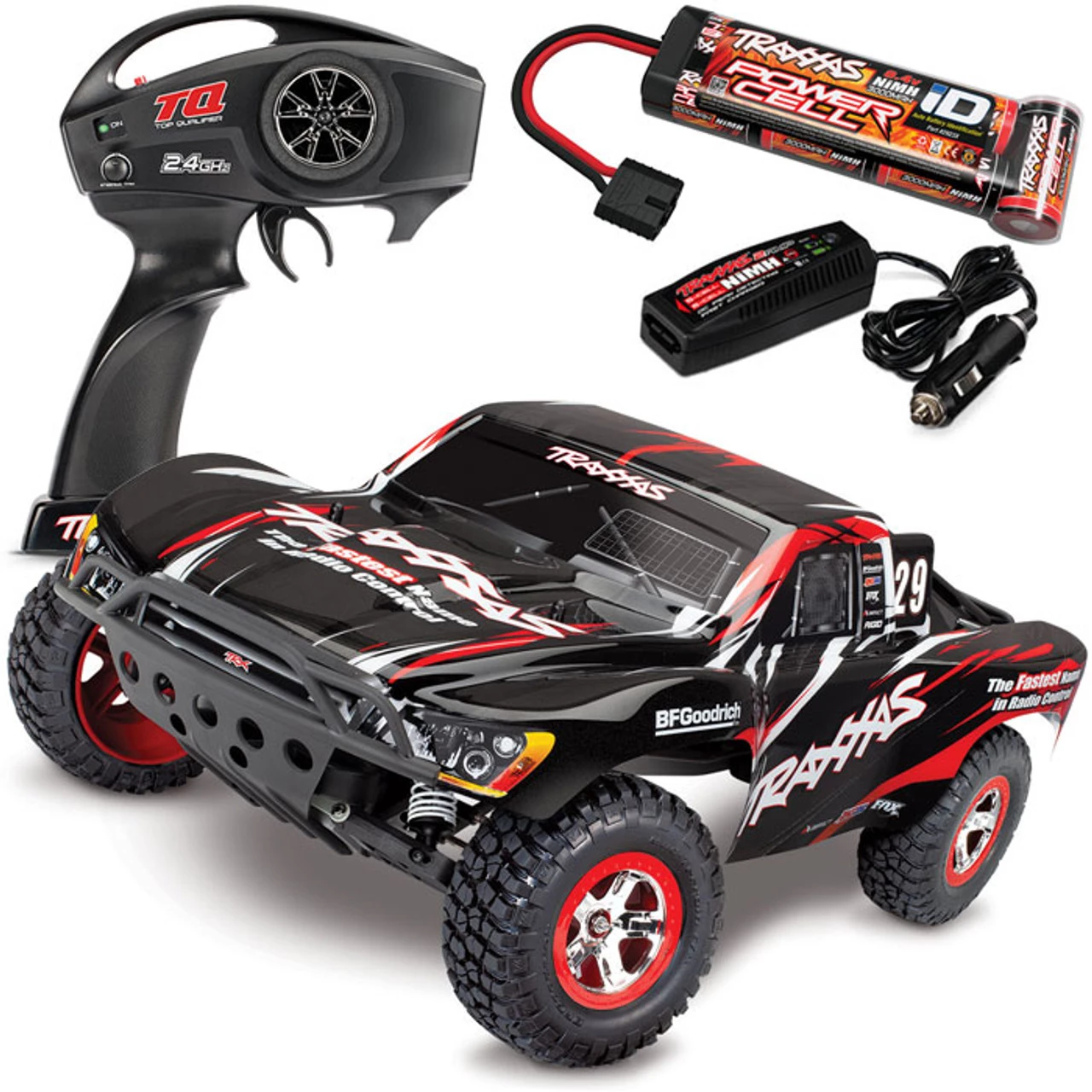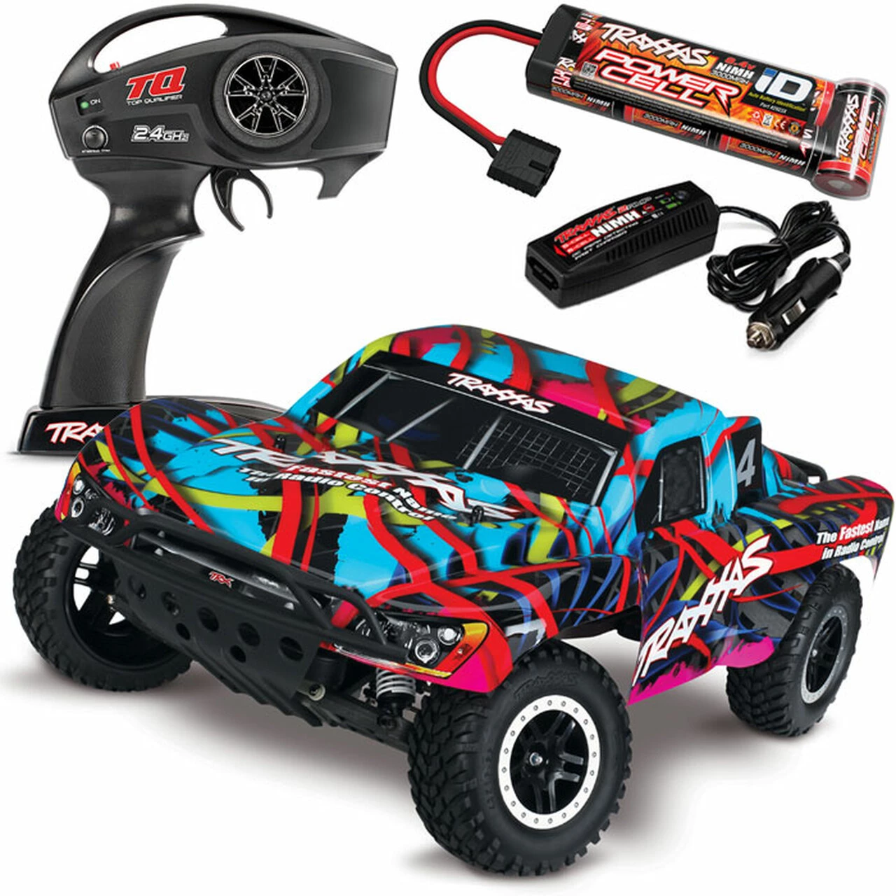 This is the Traxxas Slash 2WD Ready-to-Run Short-Course Off-Road Electric Race Truck with iD Technology Battery and Quick Charger. This truck comes fully assembled and Ready-To-Race, with a TQ 2.4GHz radio, XL-5 Waterproof Electronic Speed Control, 7-cell 8.4-Volt Traxxas Power Cell ID battery and 4-amp DC charger with Traxxas iD technology. Just add a AA batteries for the transmitter and you are Ready-to-Race! The Slash is built Traxxas Tough to keep you off the workbench and deep in the fun zone. Plus, itÂ’s upgradeable with a full line of Traxxas factory parts and accessories for custom performance and personalization.