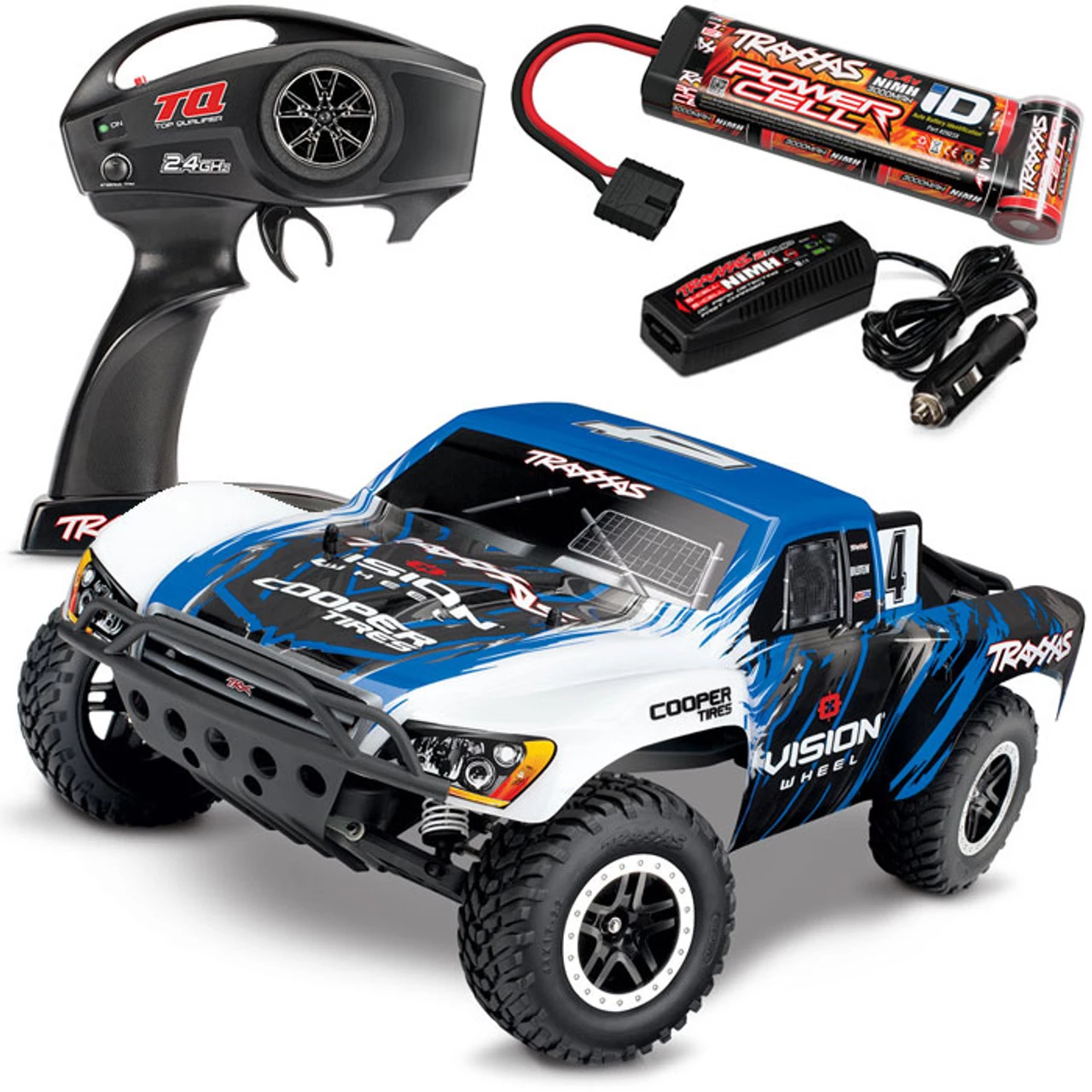 The new Traxxas Slash Short-Course Race Truck puts you in the drivers seat for intense fender-to-fender, high-flying off-road action. The full-scale Short-Course Race Trucks embody the spirit of Traxxas R/C with their extreme 900+ horsepower racing engines full-throttle, dirt-roosting power slides, giant suspension travel, and Supercross-style big-air jumps. The Traxxas Slash brings all the action home so you can experience the high-speed head-to-head competition at the track or in your own backyard. The Slash was inspired by the TORC (THE Traxxas Off-Road Championship) Pro 2WD class. The Pro 2WD class specifies rear-wheel drive trucks purpose built to fly over jumps and rip full-throttle through the turns. The Traxxas Slash hangs it out for an all new way to challenge your driving skills. The 4-wheel independent suspension has been carefully tuned to replicate the Pro 2 driving and handling experience as closely as possible. The scale appearing tires provide just the right amount of bite and thick, blinding clouds of dirt roost.