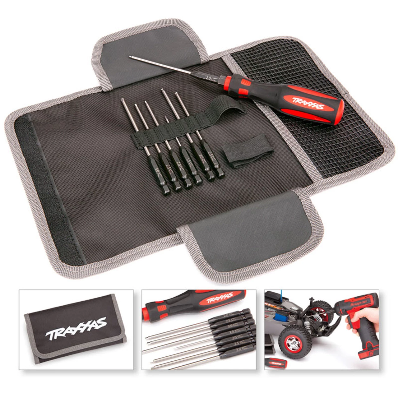 This is the Traxxas Speed Bit Master Set Metric 7-Piece Straight and Ball End Hex Driver Set with 1/4″ Drive Premium Handle and Travel Pouch.