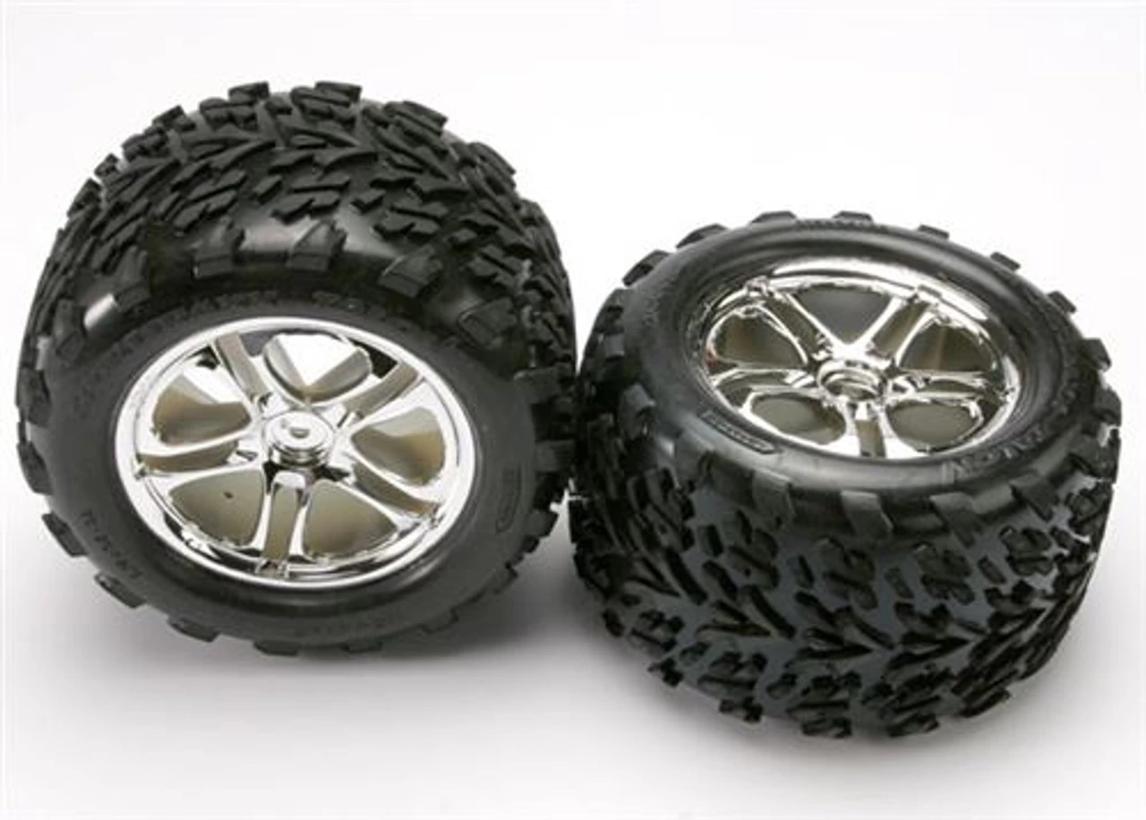 This is a pair of Traxxas Talon Tires with Foam Inserts, Pre-Mounted on 3.8″ Chrome Wheels with 14mm Hex Hubs. These can be used on 1/10 E-Revos, Revo 3.3, E-Maxx, and T-Maxx trucks using 14mm hexes.