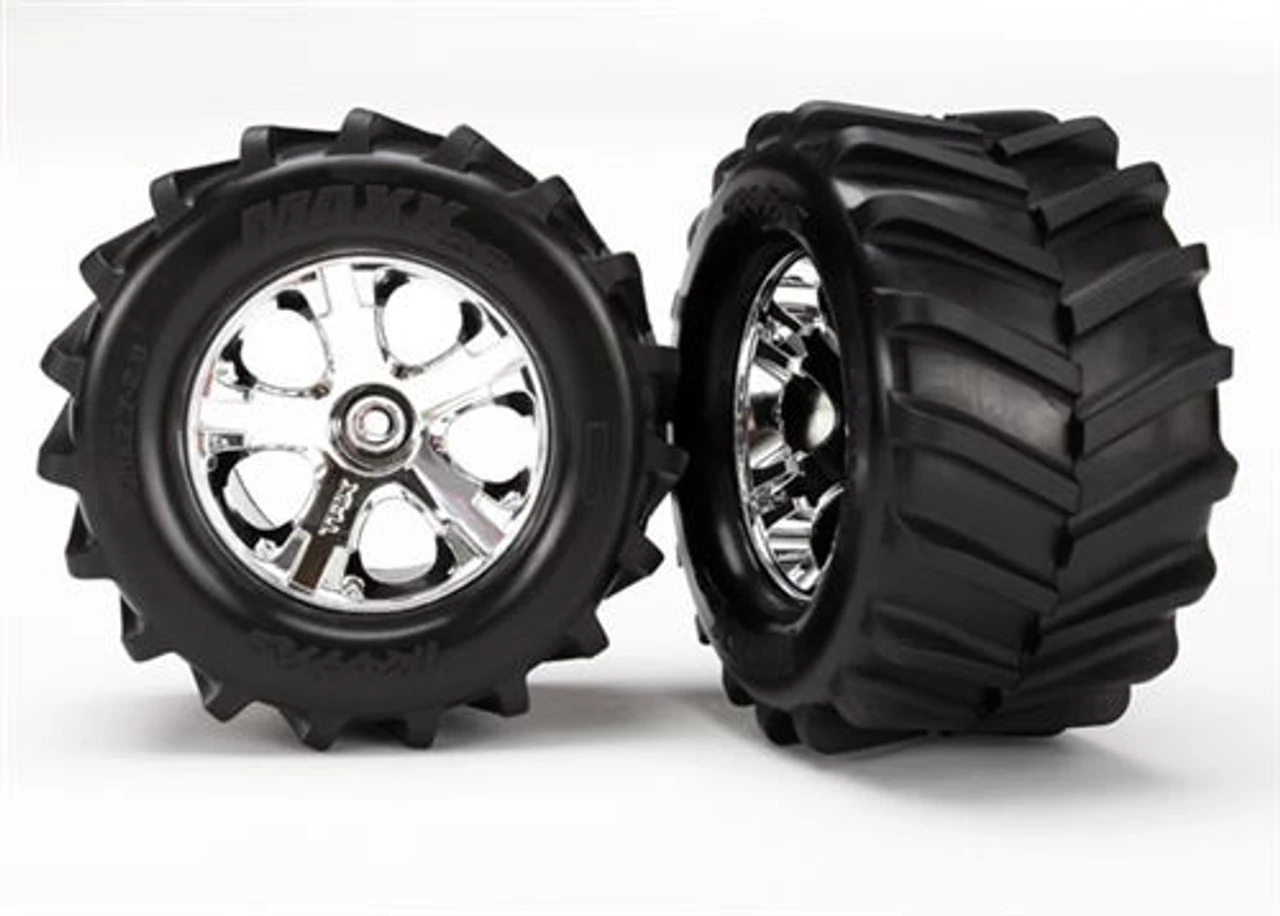 This is the Traxxas Tires and wheels, assembled, glued 2.8′ (All-Star chrome wheels, Maxx tires, foam inserts) (2). This is Traxxas part number 6771