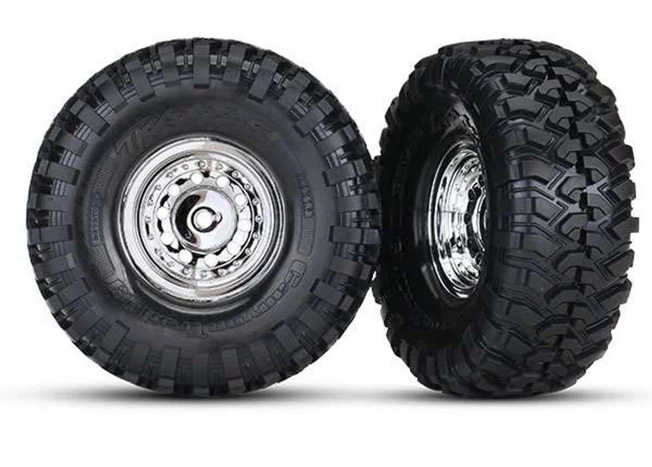 This is a pair of Traxxas TRX-4 1.9″ Canyon Trail Tires on Chrome Wheels. These come stock on the TRX-4 Ford Broncos. To run on other trucks, it would require running the #8255A extended stub axles.