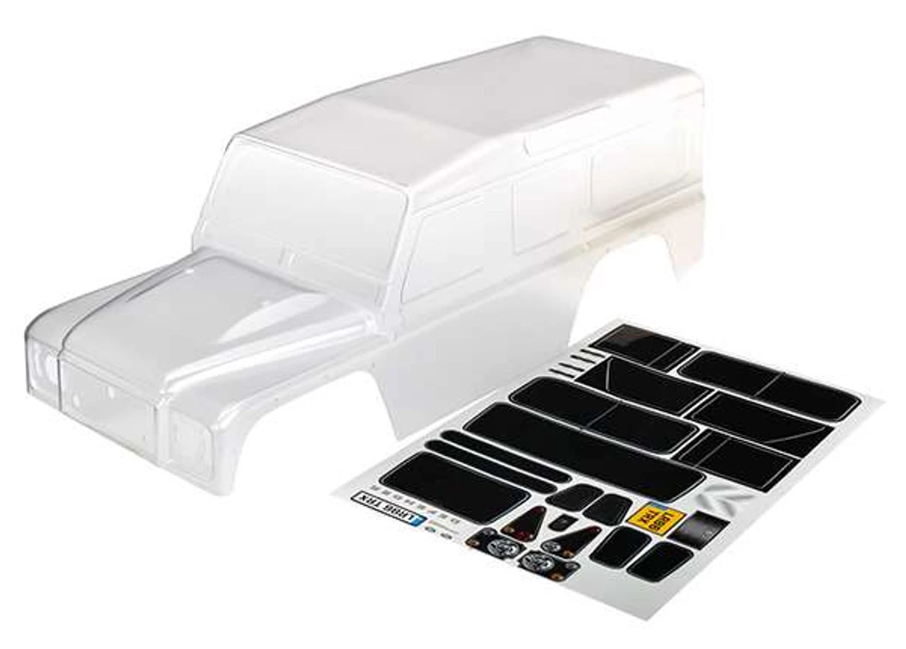 This is the Traxxas TRX-4 Clear Land Rover Defender Body with Decals and Window Masks. The body comes pre-trimmed.
