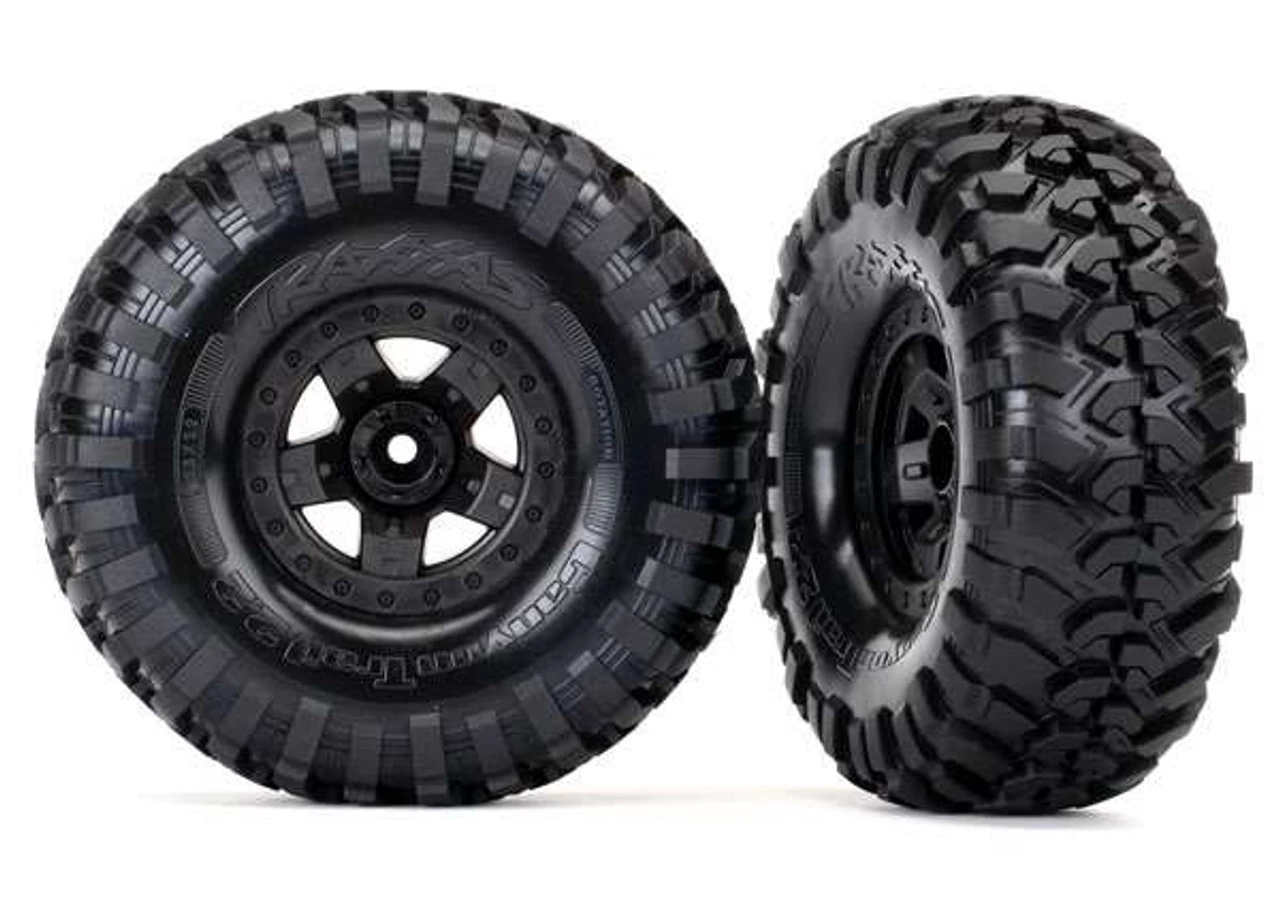 This is a pair of Traxxas Canyon Trail Tires Pre-Mounted on TRX-4 Sport Black Wheels. The tires are pre-glued to the wheels with foam inserts installed in the tires. The wheels have a 12mm hex.