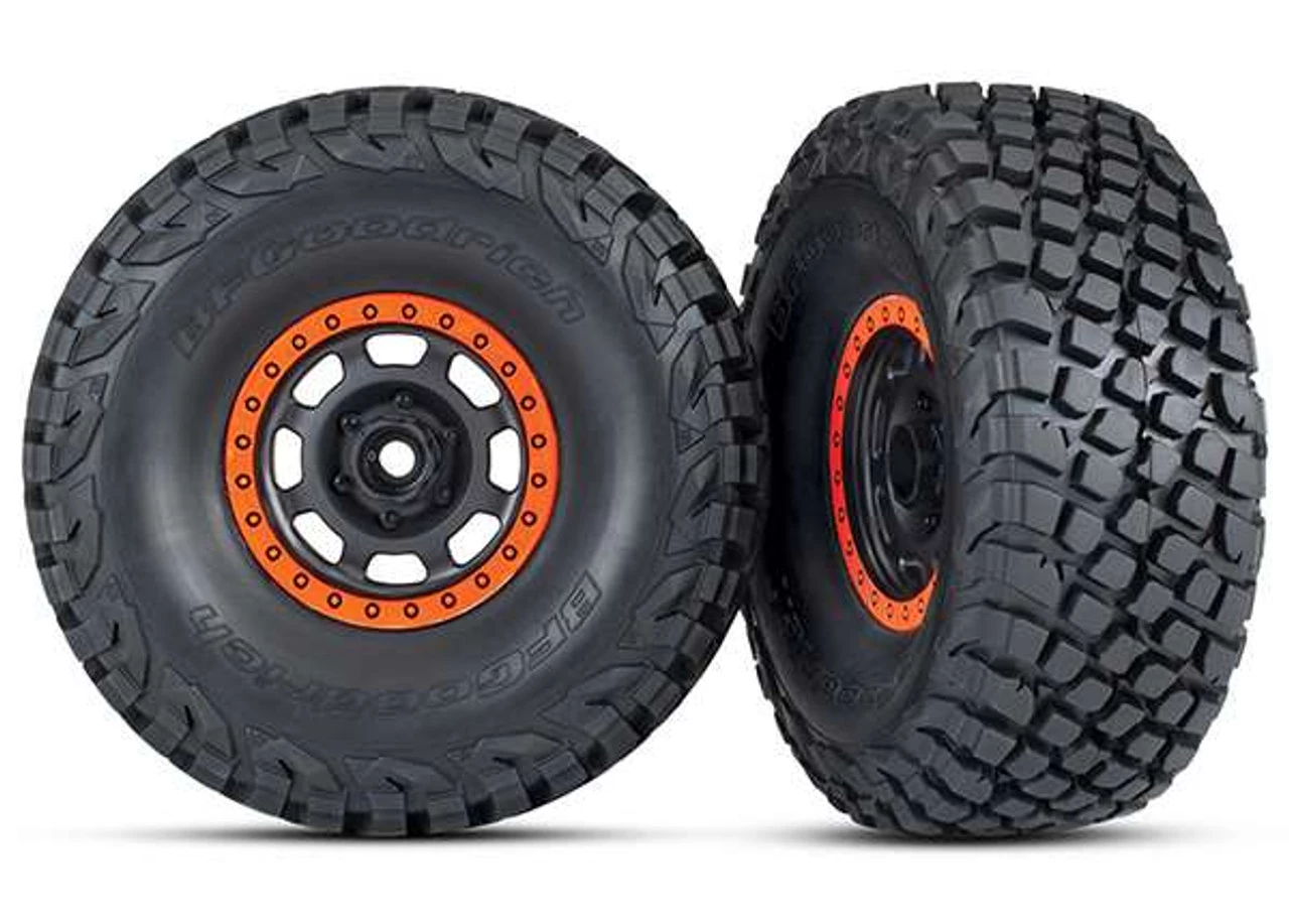 This is a pair of Traxxas Unlimited Desert Racer BFGoodrich Baja KR3 Tires on Black/Orange Desert Racer Wheels. The tires are pre-mounted with foam inserts installed.