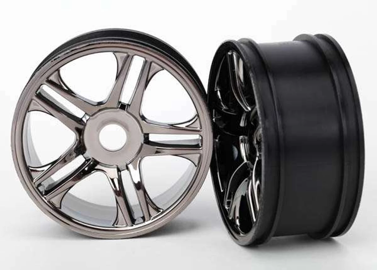 These are the Traxxas XO-1 Split Spoke Black Chrome Rear Wheels (2).